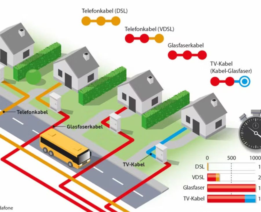 Mittlerweile gibt's mit VDSL und Glasfaser (FTTH) deutlich schnellere Optionen. So erreicht VDSL den Anschluss zuhause nicht per Kupferleitung von einer Vermittlungsstelle, sondern kommt über Glasfaser zu einem Verteiler in der Nähe des Anschlusses. Vom Verteilerkasten geht es dann über eine Kupferleitung zum VDSL-Router in der Wohnung.