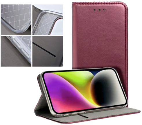 Eine klassischeHandyhüle mit Magnetverschluss mit Portemonnaie und TV-Video-Ständerfunktion. Es besteht aus unterschiedlichen Materialien und ist mit einem weichen Stoff ausgekleidet, der den Bildschirm vor Kratzern schützt.